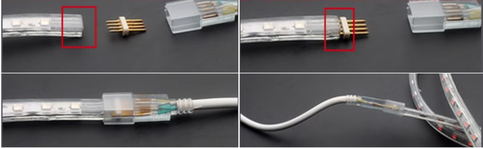 To Install: First grab a pair of disposable gloves and put them on. Then fill each light strip end connector with the optional silicone glue. Take note of the positive and negative wires on the strips and power cord. When connecting make sure the same wires, positive and positive, negative and negative, connect to each other. Take one strip and insert the light strip firmly so the two inner prongs penetrate the light strip and stop. Take a small amount of glue on on your finger and smear it around the entire end connector where the strip was inserted. Repeat this attaching process with the other strip. Recap the glue and place the assembled strip and interconnector out of the way. We recommend leaving the assembly alone for at least 12 hours to dry thoroughly.