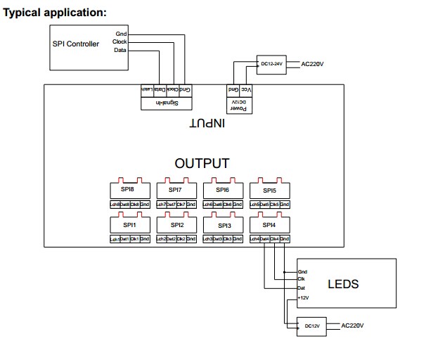 Great for expanding your high end Digital LED or Magic LED Chasing/Fading LED installation - Single SPI input with Eight (8) additional outputs for additional reels of Digital or Magic LED Pixel type Lighting!!
