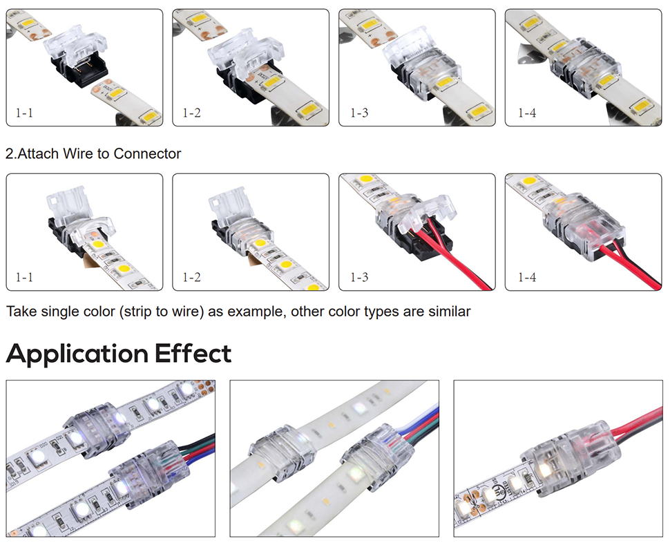 Hippo-M LED strip connector will bring you most convenience to your connection work. It support most led strip types with different diode, width, fpc thickness and waterproof method even there is no visible soldering pad on strip light. Further more user can attach different wire easily to this connector on site according to project requirement. With Hippo-M, your work or business will be so flexible.