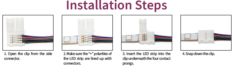 These solderless connectors install with a simple clasp attachment, meaning that you can achieve a safe and secure connection without any tools. Suitable for all LED light strip applications including kitchens, cabinets, bedrooms, shelving, and displays. Frustration-free solution for all of your LED light strip connection and extension needs.