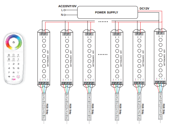 Unlimited receivers can be use with one remote within effective distance, to control LED modules/LED strips with different effects or together with synchronised effect, it also has 9 Scene-mode keys for saved effects selection, built-in 32 pre-programmed effects etc.