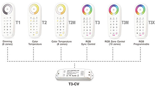 This T3-CV Receiver is an easy way to control single color, white adjustable, and RGB 12 or 24 volt DC LED strips or other RGB LEDs. Compatible with the T1, T2M, and T3 remotes, this receiver has a high pulse width modulation (PWM) frequency to reduce risk of flicker when using high frequency cameras.