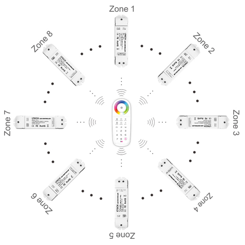 It has the ability to control the color effects of your 5-24VDC RGB+W, RGB+WW, or any 5-24VDC 4 color constant voltage lighting product. Each color wheel RF remote is specially paired by the user to any given amount of receivers over 8 zones (optional). Advanced control technology lets the user switch form "sync" and "zone" mode for smooth color changing control using multiple wireless receivers within the 2.4GHz RF range of 100ft (line of sight). Download user manual.